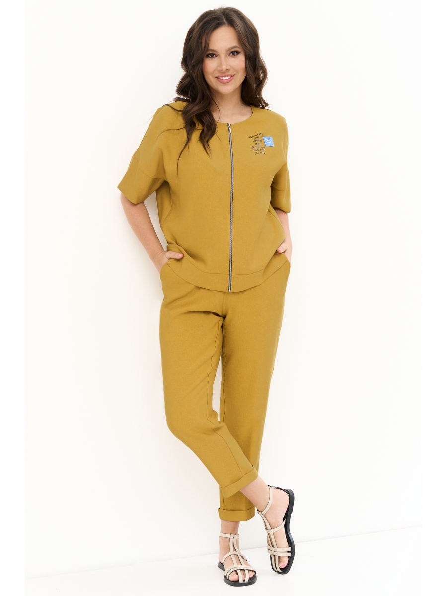 Стильный комплект из легкого жакета и брюк. Жакет свободного кроя с центральной застежкой на молнию. Рукав спущен. Брюки свободного кроя, слегка заужены к низу, с притачным поясом. Пояс дополнен эластичной тесьмой. Посадка средняя. Брюки дополнены боковыми карманами. Застежка на пуговицу и молнию.