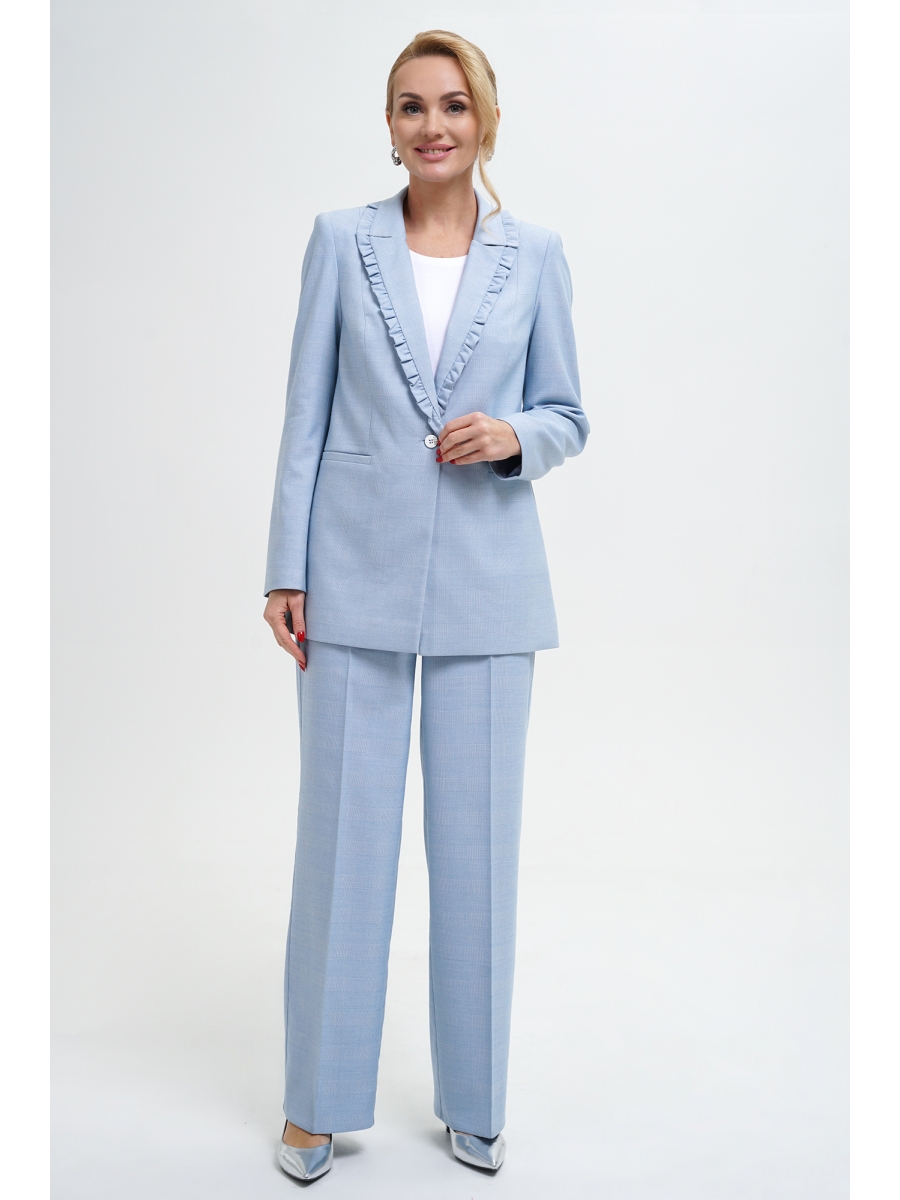 Жакет полуприлегающего силуэта, на подкладке, с центральной застёжкой на петлю и пуговицу. Декорированный по краю отлёта воротника и лацкана оборкой. По спинке съёмный хлястик с оборками пристёгивающийся на петли и пуговицы. Перед с отложными лацканами, с рельефными швами, с прорезными карманами с листочкой. Спинка со средним швом и рельефными швами. Рукава втачные, двухшовные, длинные. Воротник отложной с отворотом.