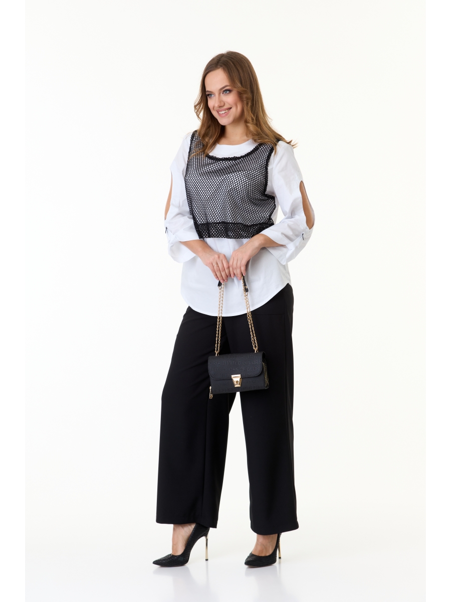 Очень стильная , красивая « двойка» .Состоит из блузона с отделочной отлетной деталью из сетки по переду. Сзади блузон на пуговичках. Рукав — 50 см , По рукаву открытый срез, в виде элепса , а по низу рукава паты с полукольцами.