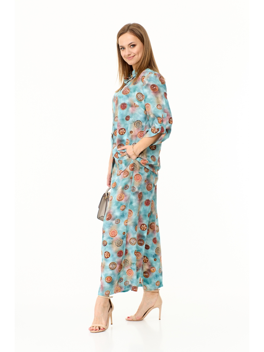 Оформить заказ →Летний ,легкий ,свободный из натуральной ткани штапеля , женский комплект ,состоит из брюк палаццо и блузона. Блузон с втачным рукавом ,который по желанию можно укорачивать,за счет пат .Воротник на стойке , что придает блузону привлекательный вид . Сзади кокетка с защипом посередине. ,прямой крой блузона. Брюки палаццо , с четырьмя защипами спереди и функциональными карманами по бокам. Сзади пояс на резинке Длина брюк 97 см. Длина блузона по спинке от плеча 75 см рукав -48 см( при желании можно укоротить ,патами )