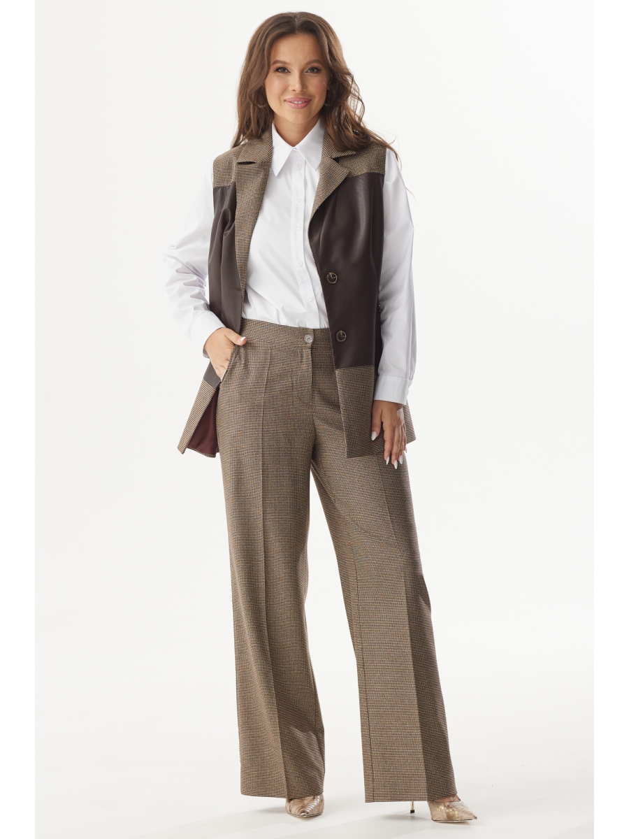 Жилет свободного кроя, на подкладке, с центральной застежкой на пришивные пуговицы. Выполнен из мягкой комфортной костюмной ткани и эко кожи премиум класса. Дополнен боковыми прорезными карманами с клапанами. Притален за счет съемного пояса, выполненного из эко кожи.
