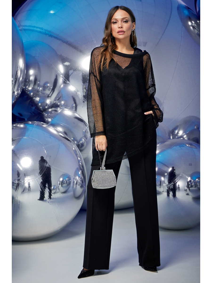 Сверху сетка туника с небольшим люрексом,мягкая,одевается на атласный топ.Соответствует размеру,фасон очень комфортный ,можно носить и без туники как вечерний или концертный вариант