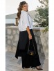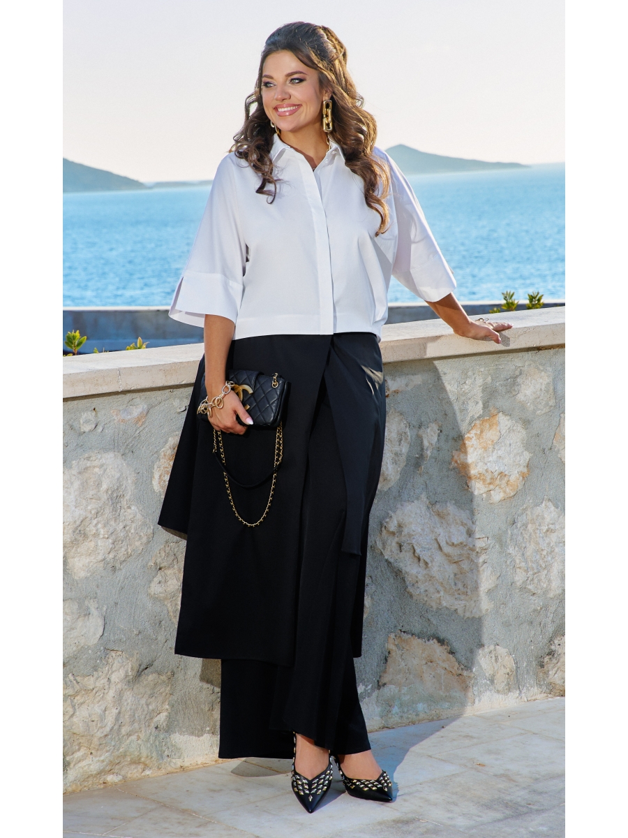 Элегантный и в меру дерзкий женский комплект состоит из укороченной блузки белого цвета и чёрных, широких, многослойных брюк.