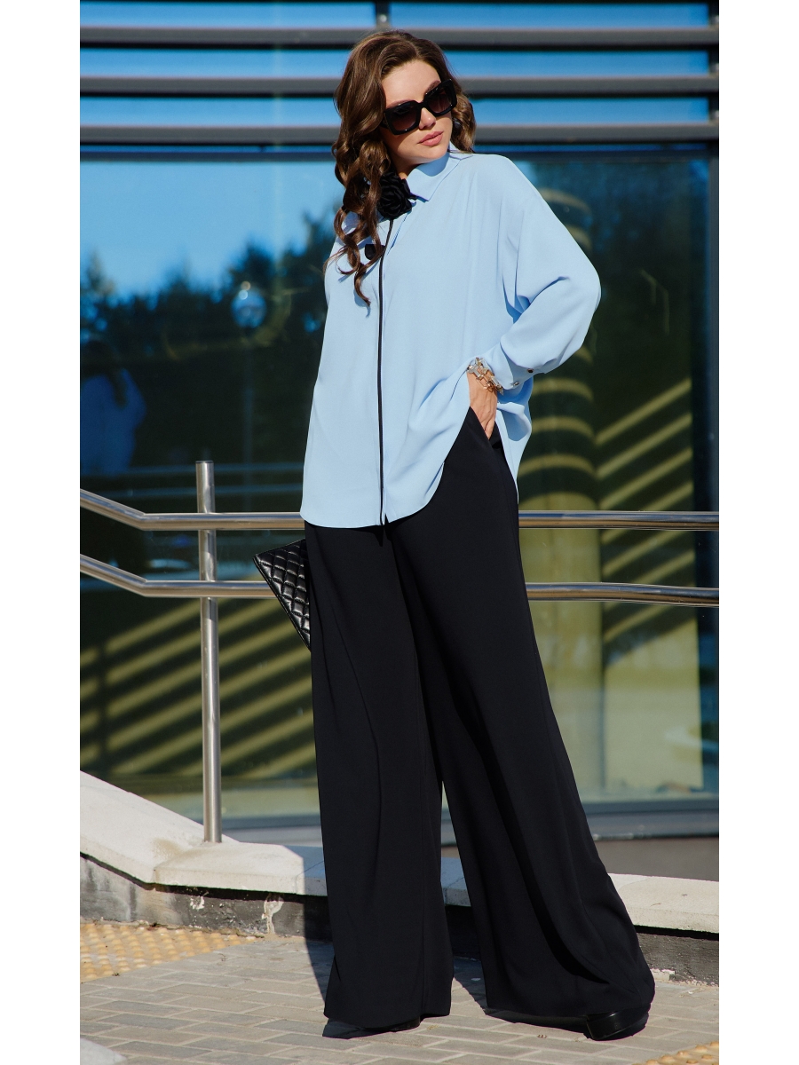Костюм, который станет ярким акцентом, идеален для торжественных праздничных мероприятий, а также подойдёт для работы в офисе. Всегда актуальный классический чёрный смотрится модно, а нежный голубой цвет блузки освежает образ.