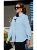Блузка свободного силуэта с центральной потайной застёжкой на петли пуговице по планке, воротником рубашечного типа. В качестве дополнительного декоративного элемента по планке идет кант из отделочной ткани и декоративная брошь «цветок». Спинка в блузке со средним швом. Рукав втачной, длинный с заложенными складками по низу. По низу рукава манжета с застёжкой на петли пуговицы. Низ в блузке закруглённый, ассиметричный.