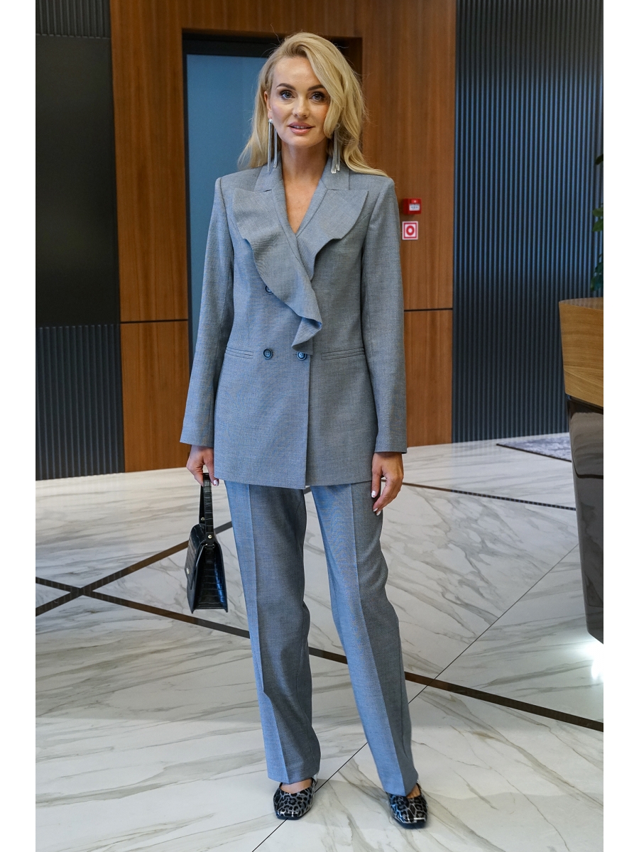 Жакет полуприлегающего силуэта, на подкладке с двухбортной застёжкой на петлю, пуговицы и с внутренней застёжкой на петлю, пуговицу. Перед с рельефными швами, прорезными карманами с двумя обтачками. Спинка с рельефными швами и средним швом. Рукава втачные, двухшовные, длинные. Воротник отложной с отворотом по краю отлёта лацкана волан.
