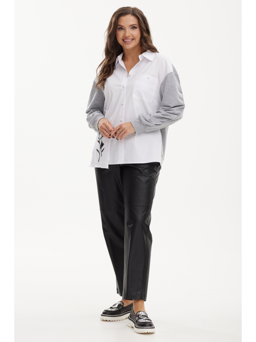 Блуза рубашечного кроя с центральной застежкой на пришивные пуговицы. Горловина обработана отложным воротником. Рукав втачной, слегка спущен. Выполнен из трикотажного полотна серого цвета.Дополнен притачной манжетой и декоративной сборкой. Спинка так же выполнена из трикотажного полотна.