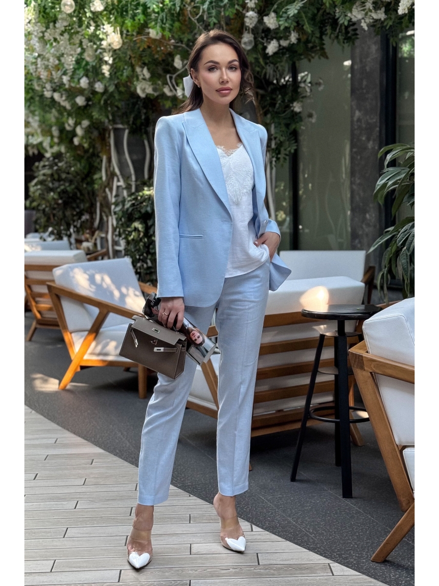 Костюм женский, двух предметный состоит из жакета и брюк, выполненных из костюмно- плательной ткани лен.
