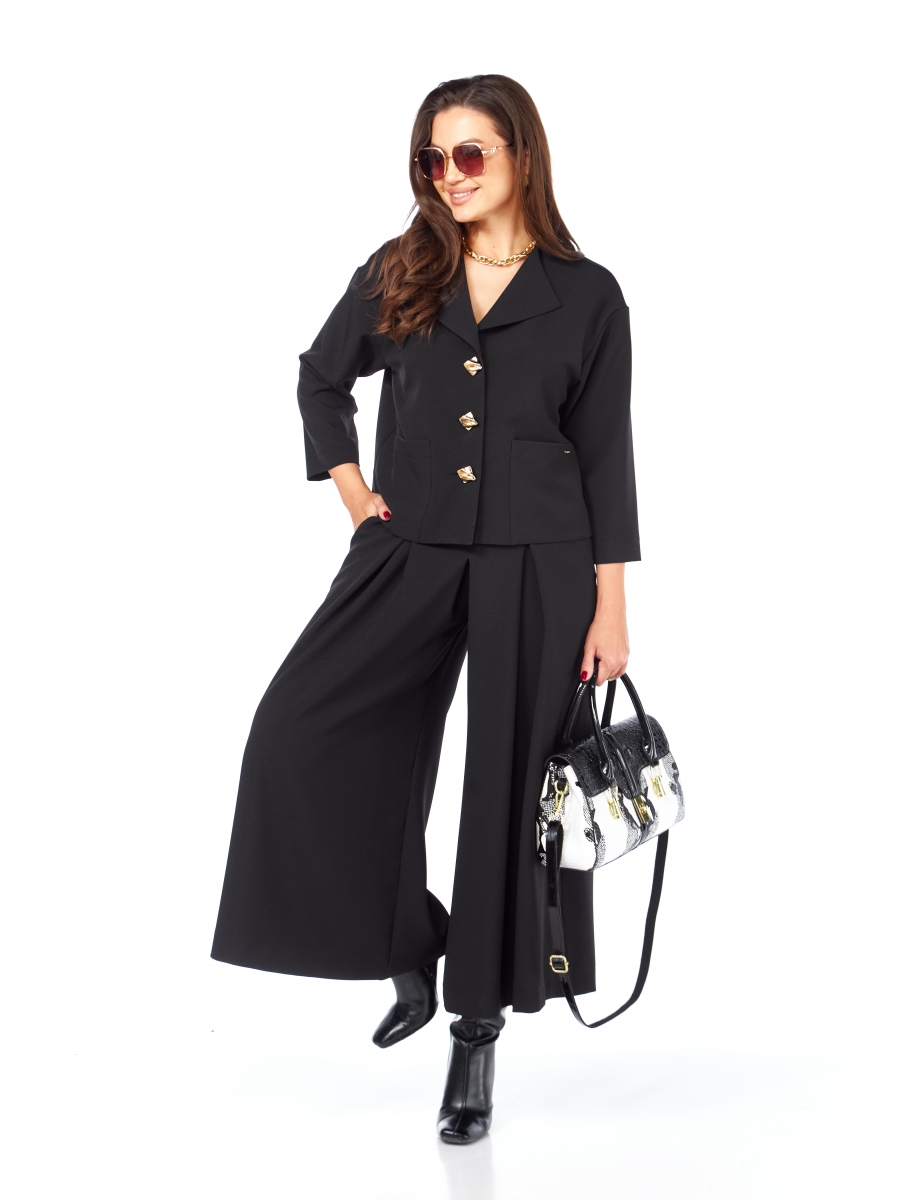 Очень стильный, элегантный, модный женский комплект, состоит из юбки-брюк (кюлоты) и жакета, с интересным воротником, с дорогой фурнитурой, накладными карманами с лейбой золотистого цвета.