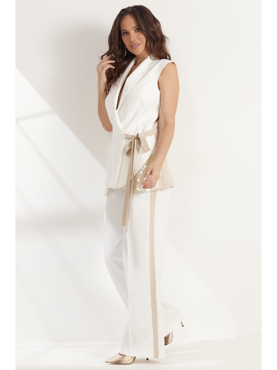 Жилет полуприлегающего силуэта, на подкладке, с центральной застежкой на потайные кнопки. Так же жилет дополнен пришивным поясом. Воротник отложной. Спинка и отделочные элементы жилета и брюк выполнены из слегка мерцающей поливискозной ткани, что придает комплекту неповторимый шарм. Так же жилет дополнен вставками из сетки с мерцающими пайетками.