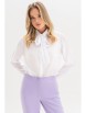Блузка женская с центральной бортовой застёжкой на 7 петель и пуговиц. Перед с нагрудными вытачками, идущими от бокового шва. Горловина обработана воротником стойкой, в стойке закреплен не съемный завязывающийся бант. Рукава втачные одношовные, длинные. Низ рукава обработан притачной манжетой, застегивающийся на петлю и пуговицу. Низ блузки ассиметричный, перед короче спинки, По низу боковых швов обработаны разрезы.