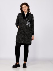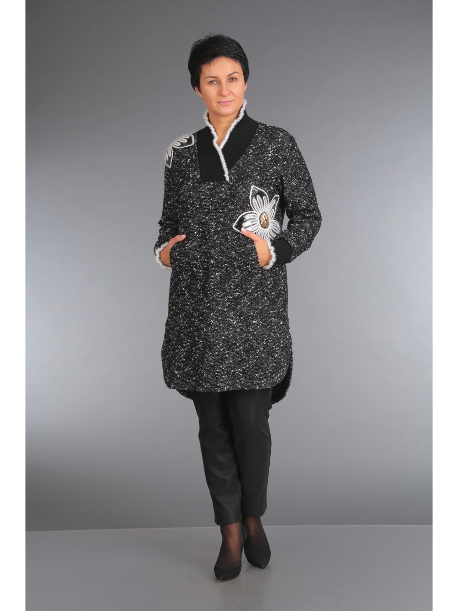 Туника из трикотажной меланжевой ткани средней растяжимости, декорирована цветами из ангоровой тесьмы и пайеток. Довязы на горловине и манжетах оторочены вязаной тесьмой из ангоры. По переду расположен карман-кенгуру.