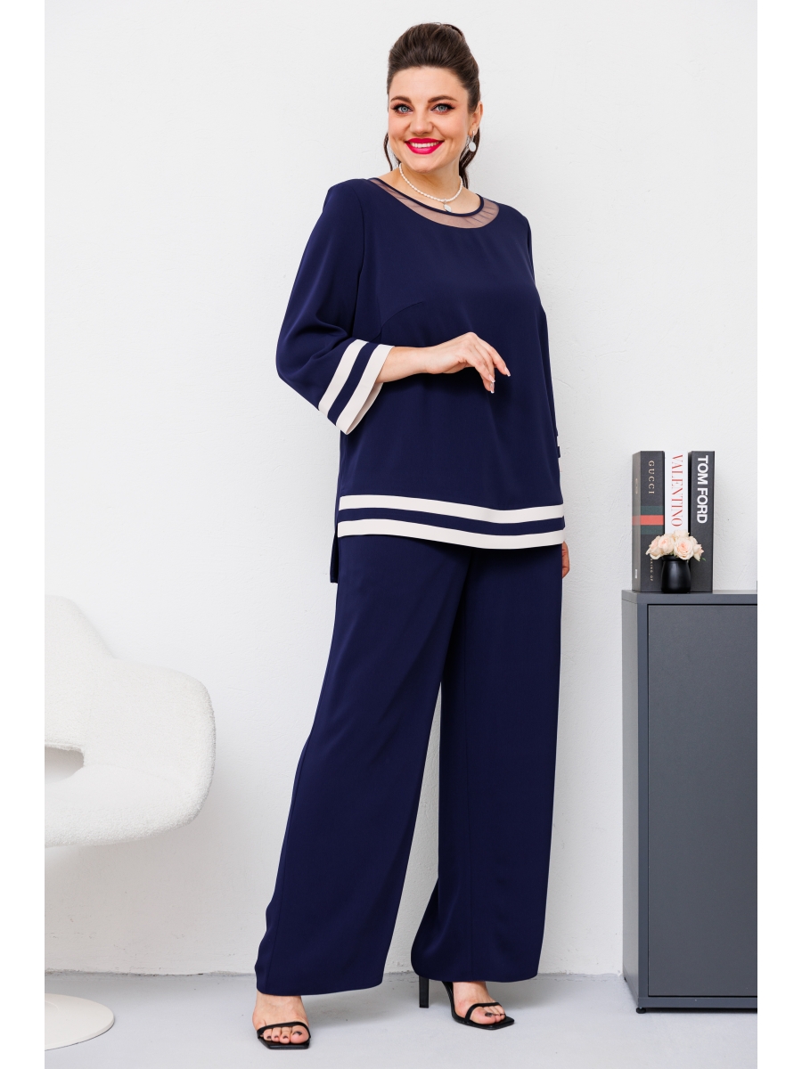 Блузон женский прямого силуэта, длиной ниже линии бёдер. Перед с 2-мя нагрудными вытачками, с декоративной вставкой по горловине, с горизонтальным подрезом внизу, с чередованием горизонтальных вставок из отделочной ткани. Спинка вверху с разрезом "капелькой"обработанным косой бейкой, фиксирующимся на 1-ну навесную петлю и 1-ну пришивную пуговицу. Горловина круглая, без воротника, обработана косой бейкой. Рукав втачной, одношовный, длиной 3/4, с притачной манжетой с чередованием горизонтальный вставок из отделочной ткани. Боковые швы с разрезами, низ фигурный, низ фигурный "ступенька". Блузон с плечевыми накладками.
