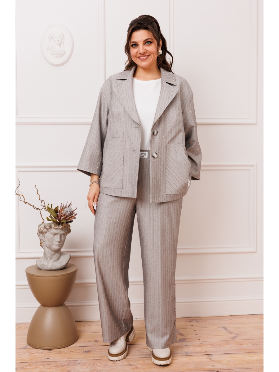 Жакет женский прямого силуэта, свободного кроя, длиной ниже линии бёдер на 5 см. Перед с 2-мя нагрудными вытачками, с 2-мя накладными фигурными карманами, левый декорирован надстрочной аппликацией. Спинка с отрезной кокеткой, с застёжкой в среднем шве на 4-и обмётанных петли и 4-и пришивных пуговицы. Горловина с V-образным вырезом, с воротником втачным пиджачного типа с притачным лацканом. Застёжка центральная бортовая на 2-е обмётанные петли и 2-е пришивные пуговицы. Жакет со спущенным плечом. Рукав втачной одно шовный, длиной 7/8. Жакет на притачной подкладке. Жакет без плечевых накладок.
