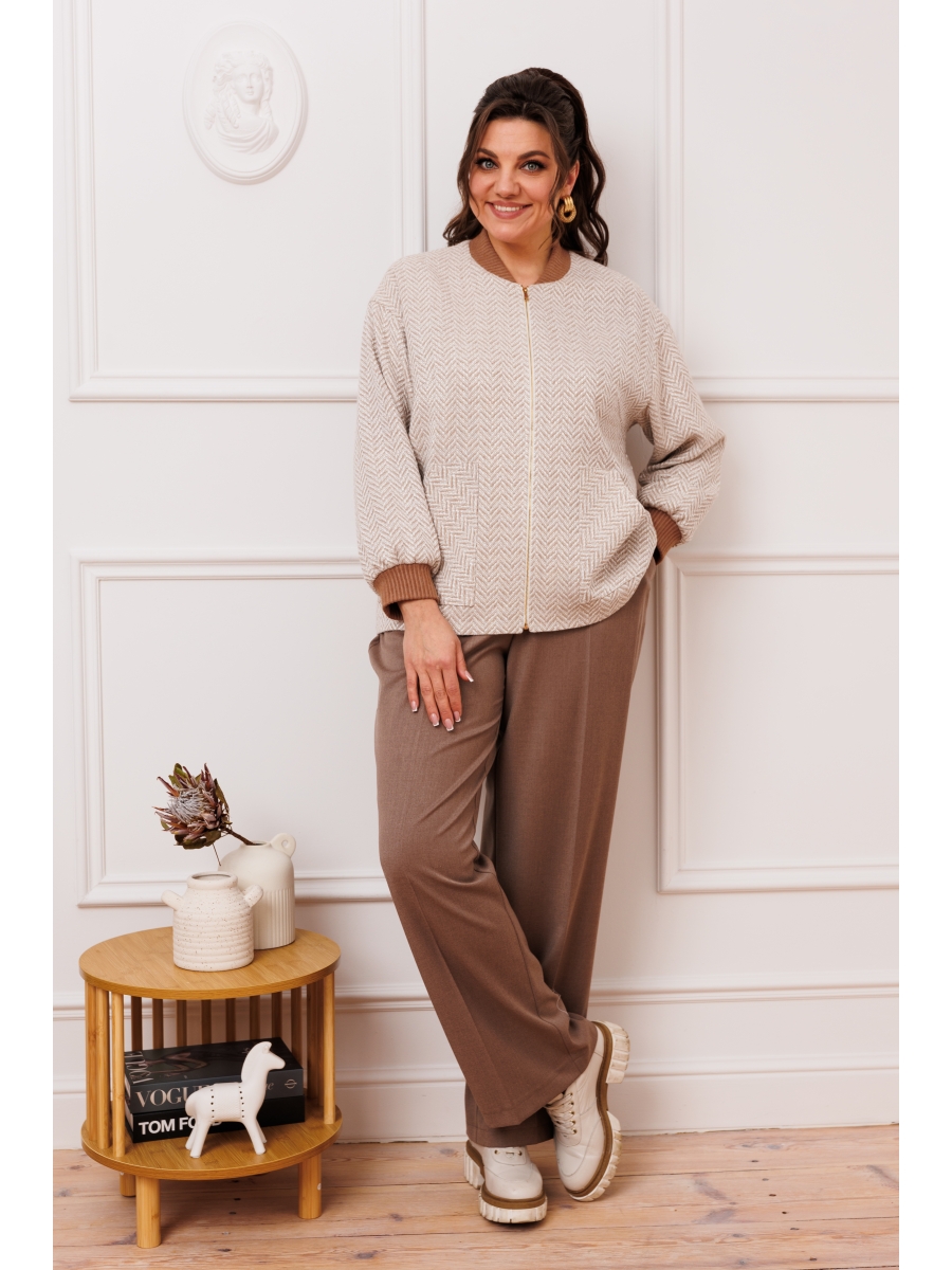 Жакет женский прямого силуэта, длиной ниже линии бёдер. Перед с 2-мя нагрудными вытачками, с 2-мя накладными фигурными карманами. Спинка без конструктивных особенностей. Горловина круглая с втачной стойкой из отделочной ткани. Застёжка центральная бортовая на разъёмную тесьму-молнию. Жакет со спущенным плечом. Рукав втачной одно шовный, длинный с притачной манжетой из отделочной ткани. Жакет на притачной подкладке. Жакет без плечевых накладок.