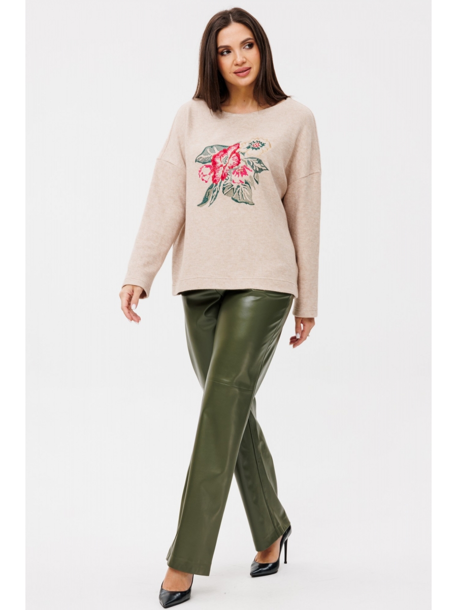 Джемпер свободного силуэта из трикотажа. Горловина округлая, обработана обтачкой. Полочка цельная, на груди дизайнерская вышивка. Спинка со средним швом. Рукав одношовный втачной длинный, линия плеча спущена.
