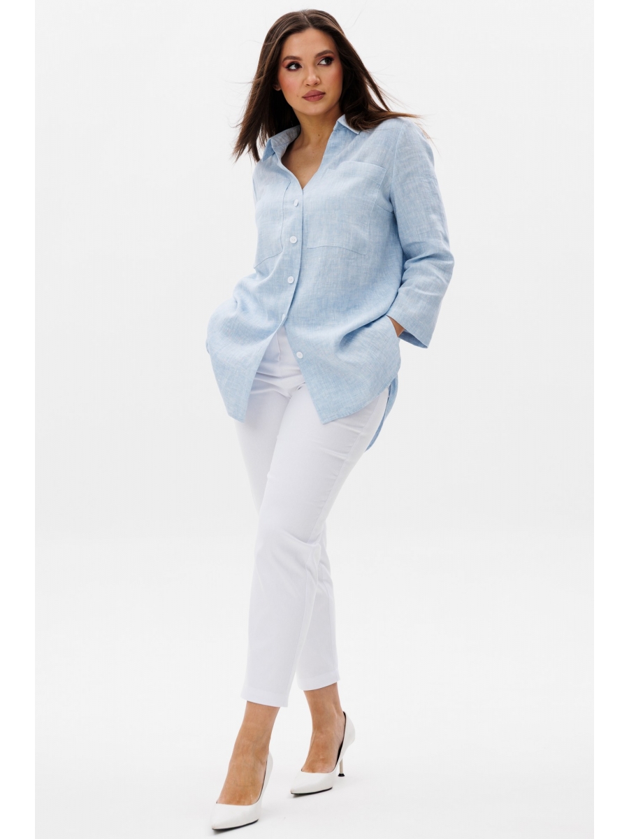 Рубашка свободная. Полочка с нагрудной вытачкой, идущей из бокового шва. Застежка на фигурную планку на петли и пуговицы. Горловина с отложным воротником на полустойке. Рукав втачной, длиной 7/8, низ рукава прямой. Спинка с кокеткой и бантовой вертикальной складкой. Низ фигурный с удлиненной спинкой. Рубашка выполнена из качественного белорусского льняного полотна (пр-во Орша). Ткань не тянется.
