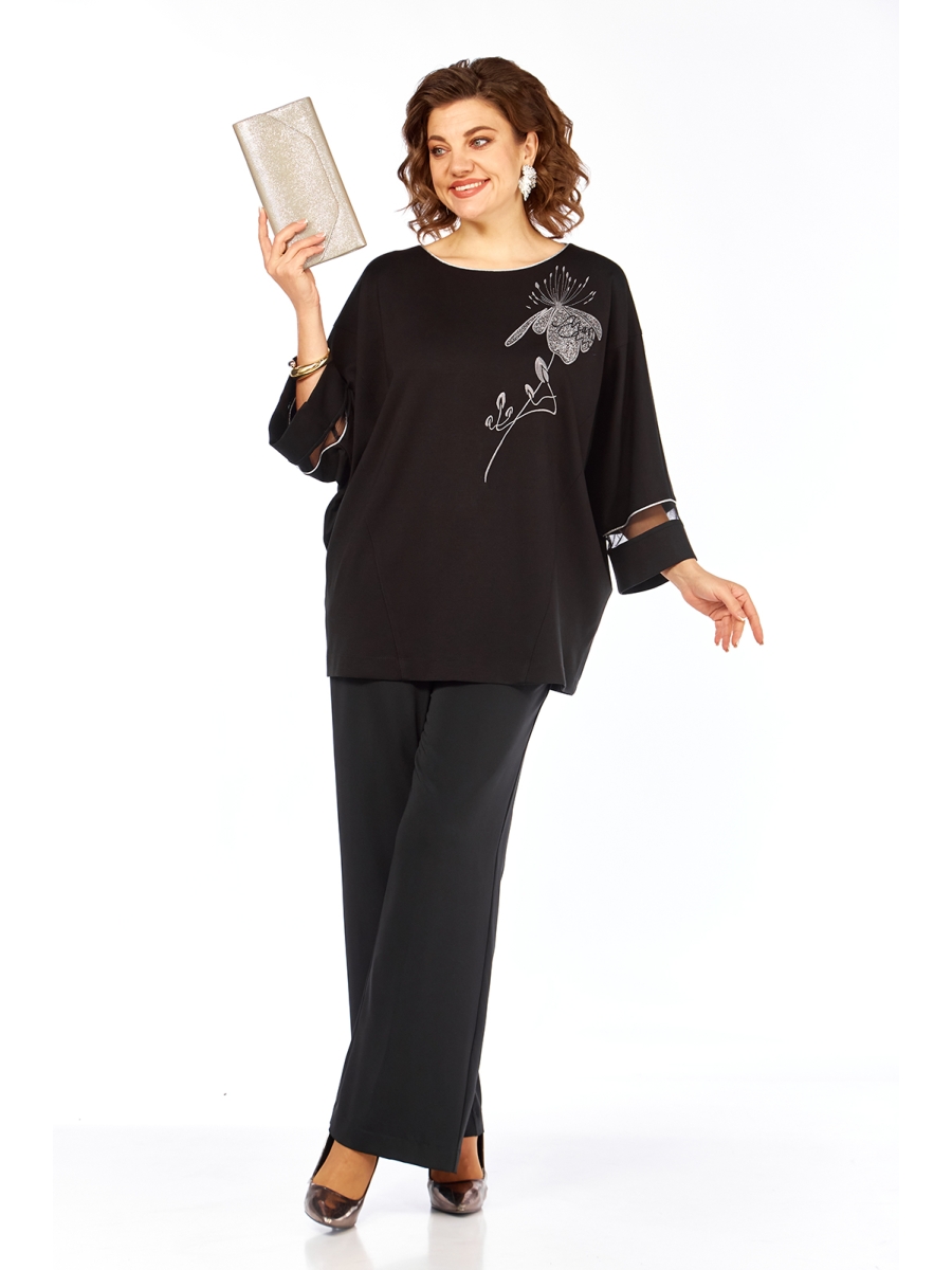 Джемпер женский свободного кроя. Перед разрезной, с дизайнерской вышивкой — аппликацией. Горловина круглой формы с кантом. Рукава цельнокроеные со вставками из сетки и с кантом.