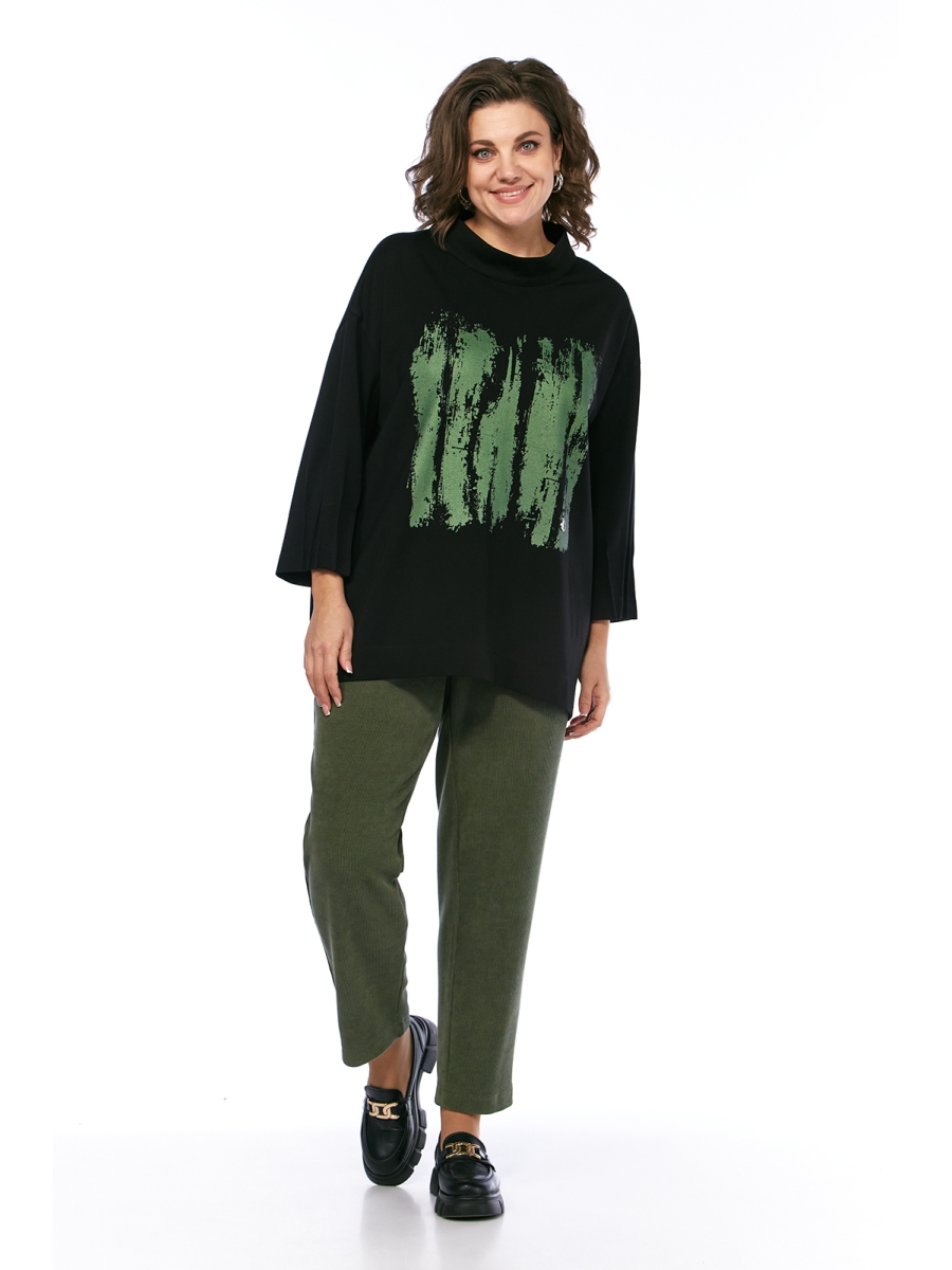 Джемпер свободного силуэта, выполнен из трикотажного полотна. Горловина обработана воротником-стойка. Перед и спинка цельнокроеные. Рукава спущенные с защипами. Джемпер дополнен дизайнерской печатью.
