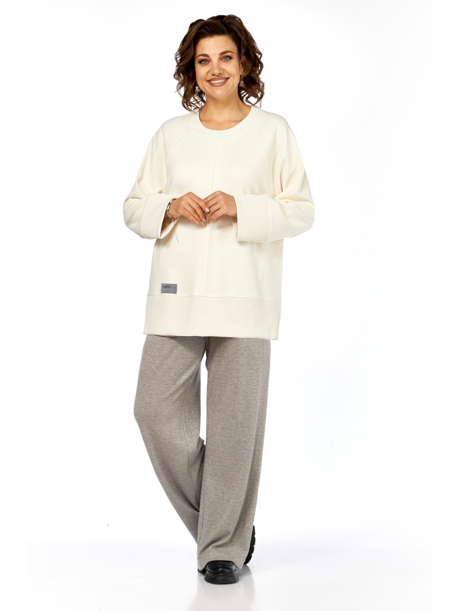 Джемпер свободного кроя. Горловина круглой формы. Рукава-реглан. В боковых швах обработаны разрезы. Горловина, низ изделия и низ рукавов изготовлены из отделочного трикотажного полотна. В качестве отделки нашивка по переду.