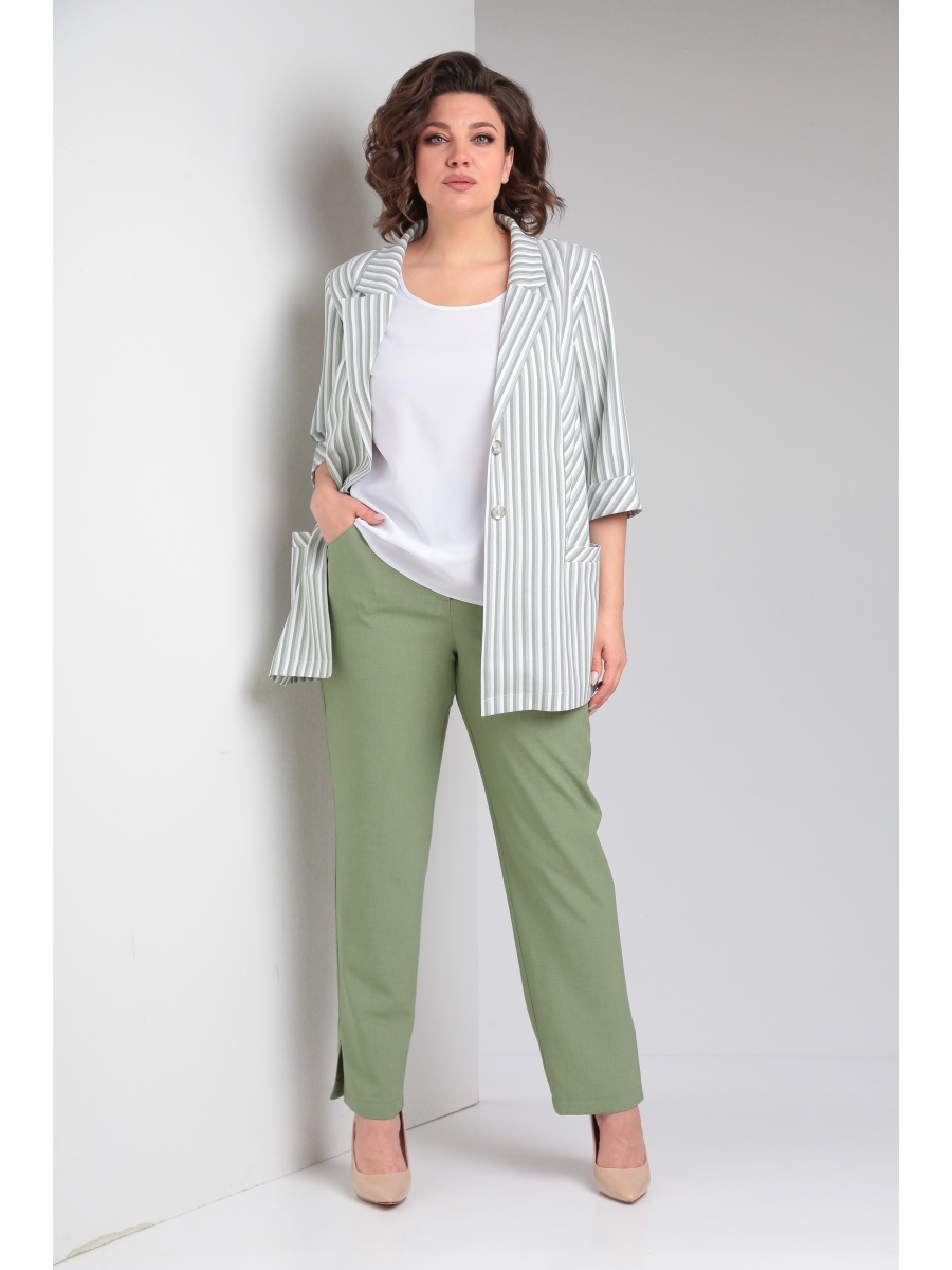 Женский комплект-тройка, состоящий из жакета, брюк и блузы, которые можно носить отдельно друг от друга, дополняя другими предметами гардероба. Стильная полоска жакета — это яркий акцент, а мягкий однотон брюк — лучший для него компаньон. Светлая, базовая блуза освежает комплект и добавляет нужный контраст в верхней части образа.