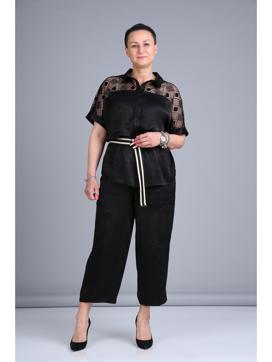 Костюм брючный выполнен из тонкой шелковой ткани. Вставки по плечу и рукаву выполнены из сетки. На передних половинках брюк обработаны карманы. Пояс брюк - декоративная резинка.