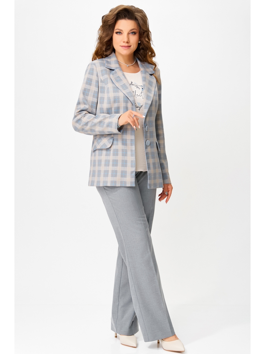 Жакет — как изысканный аккорд, он подчёркивает силуэт с полуприлегающей посадкой. Однобортная застёжка на две пуговицы и овальные лацканы придают образу благородную строгость. Внутренняя подкладка из ткани в клетку — скрытая деталь, которая говорит о внимании к стилю даже в мелочах. Прорезные карманы с клапанами и декоративный кант по краю борта, воротника и клапанов — штрихи, создающие изысканный контур.