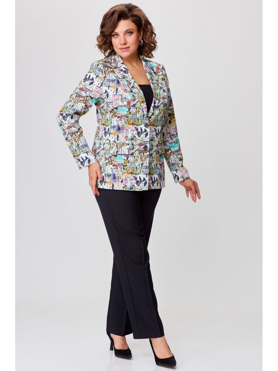 Жакет удлиненный, полуприлегающего силуэта с центральной бортовой застежкой на пуговицы до линии перегиба лацкана. Спереди рельефные швы от плечевого шва, отрезной бочок и карман с клапаном. Спинка с рельефами от плечевого шва. Рукав втачной, двухшовный. Воротник пиджачного типа. Жакет на подкладке.