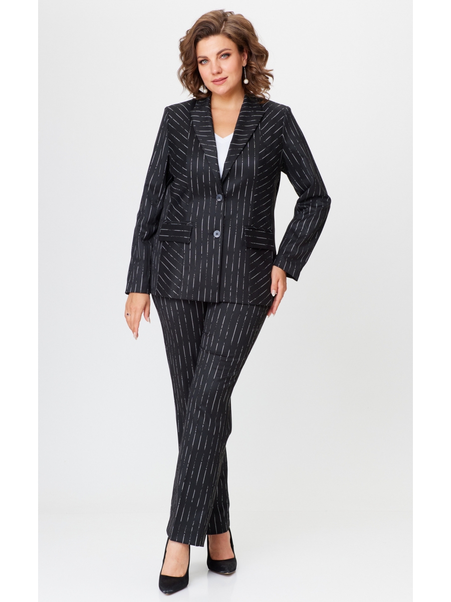 Жакет удлиненный, полуприлегающего силуэта с центральной бортовой застежкой на пуговицы до линии перегиба лацкана. Спереди рельефные швы от плечевого шва, отрезной бочок и карман с клапаном. Спинка с рельефами от плечевого шва. Рукав втачной, двухшовный. Воротник пиджачного типа. Жакет на подкладке.