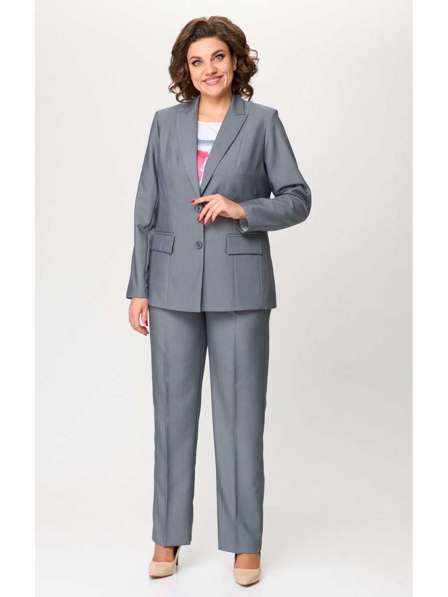 Брюки прямые, классические, с заутюженными стрелками, по переду обработаны карманы с отрезным бочком, застежка на тесьму-молнию и 1 пуговицу. На задних половинках обработаны вытачки и имитация карманов с листочкой, пояс в брюках притачной.