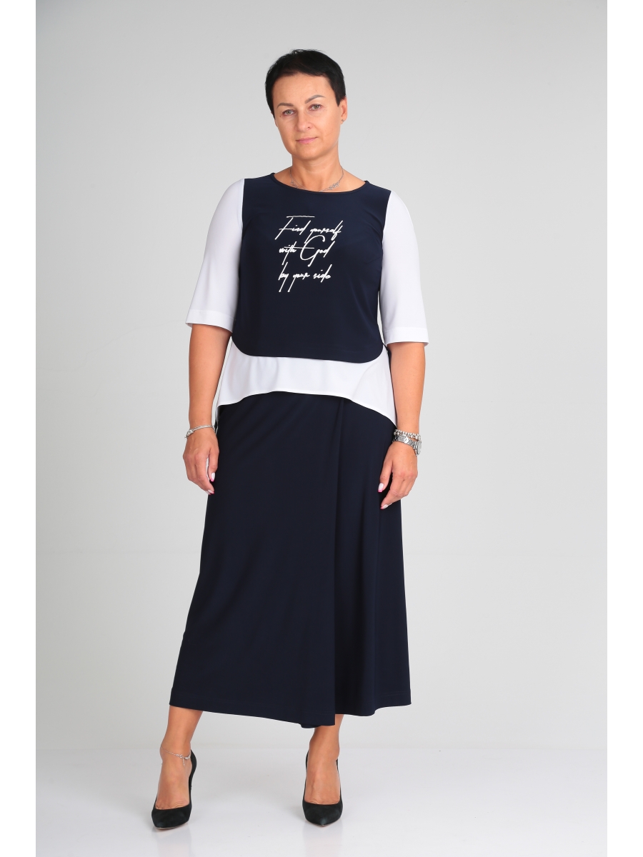 Блуза по переду состоит из двух частей, отрезная по талии. Верхняя часть из основной ткани с двумя нагрудными вытачками, декорированна печатью, нижняя часть из отделочной ткани расширенная.шов стачивания верхней и нижней части образует наплыв с отделочной строчкой. Спинка из двух частей, отрезная по талии,верхняя часть из основной ткани, нижняя из отделочной с добавлением декоративной детали из сетки. Шов стачивания верхней части с нижней с наплывом и отделочной строчкой. Горловина круглая. Рукав одношовный, втачной, с вытачкой по головке. Длина до локтя из отделочной ткани.