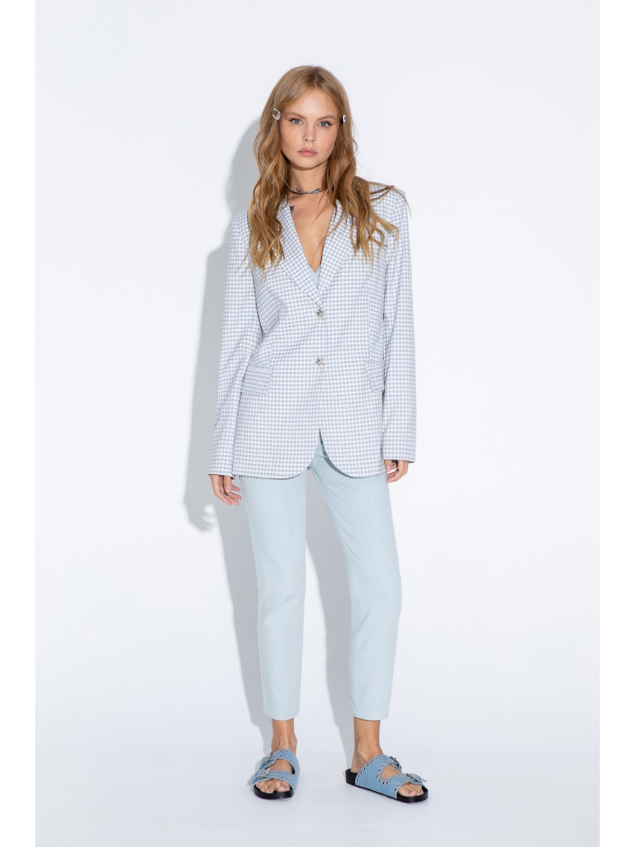Комплект-двойка из свободного жакета в клетку и джинсовых укороченных брюк.