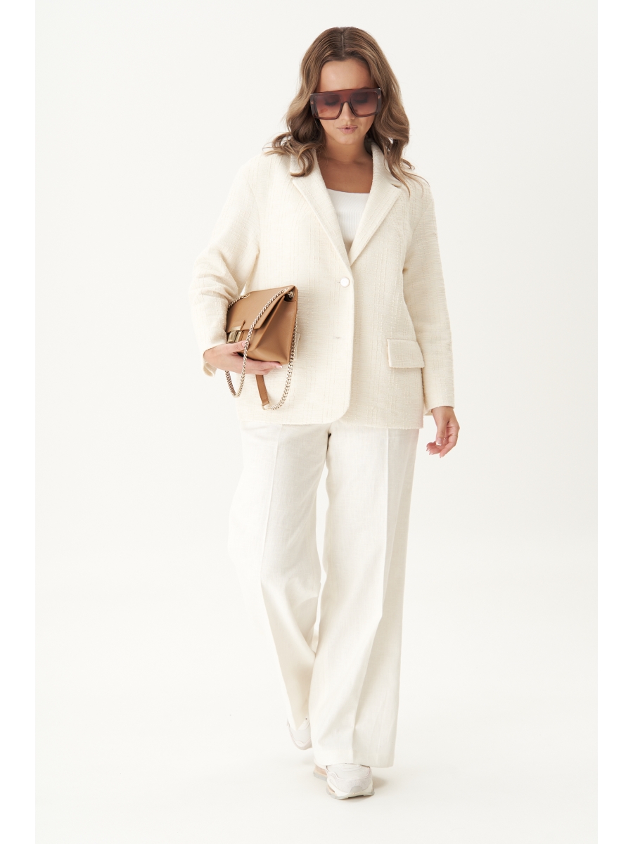 Свободный упрямлённый жакет в расслабленном стиле с мягкой плечевой линией, центральной застёжкой, классическим английским воротником, прорезными карманами с клапаном и свободным одношовным рукавом с манжетой.