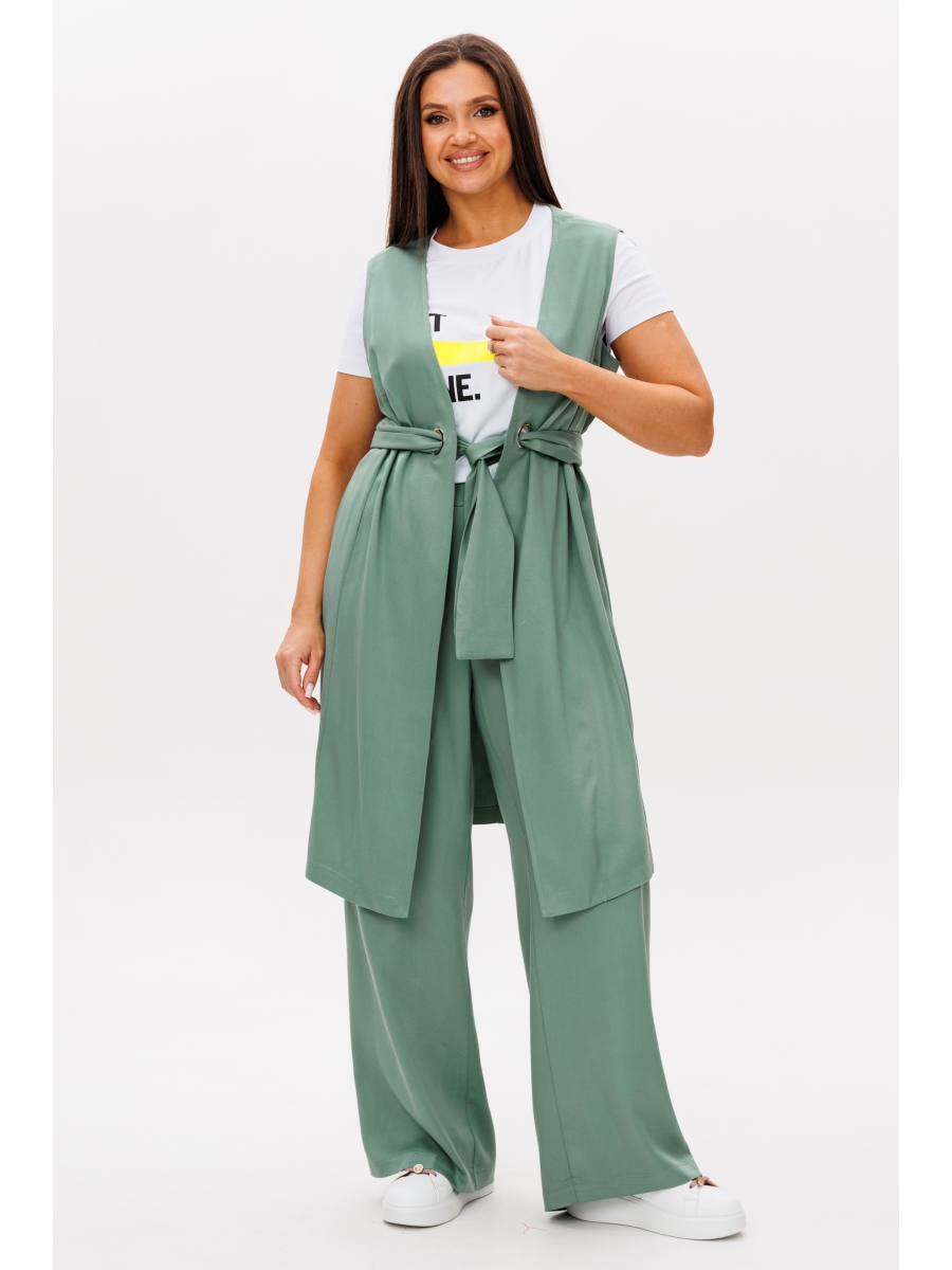Свободный удлинённый жилет и комфортные брюки в расслабленном стиле. Жилет А-силуэта, без застёжки, с декоративными люверсами и отделочным шарфом. Полочка с боковым рельефом и нагрудной вытачкой. Спинка со средним швом и боковым рельефом.