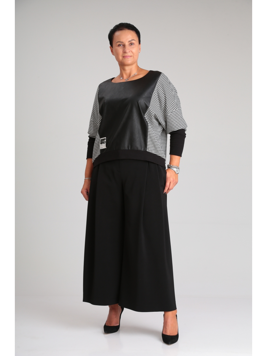 Джемпер свободного кроя. Плечо спущено. По переду два рельефа. Центральная чась переда из кожи, с декоративной нашивкой. Спинка цельная. Горловина круглая на обтачке. Низ изделия на довязе. Рукав одношовный, втачной, на широком довязе.