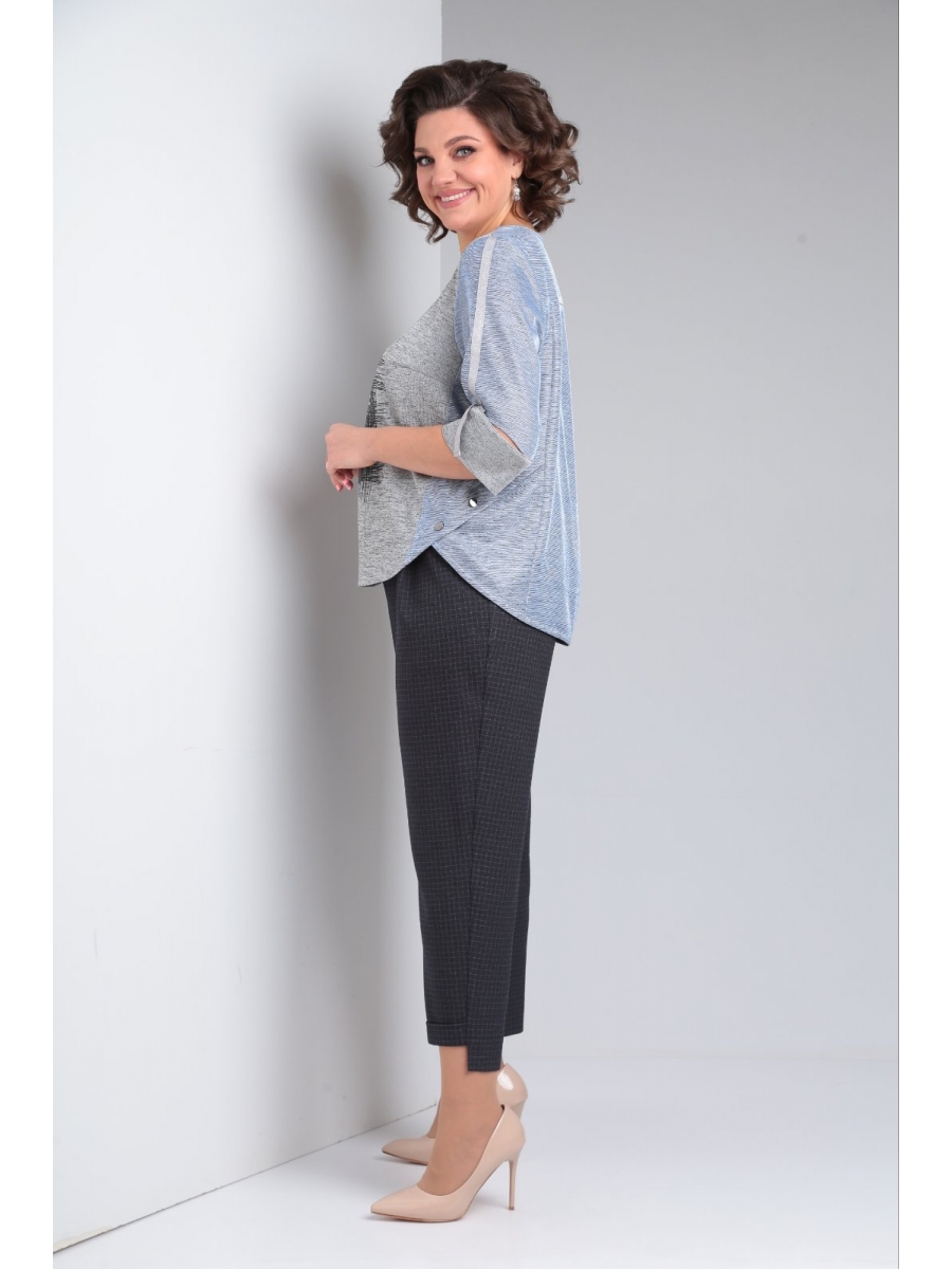 Комплект брючный выполнен из разных видов ткани: брюки-костюмная,блуза-трикотажное полотно с люрексовой нитью.
