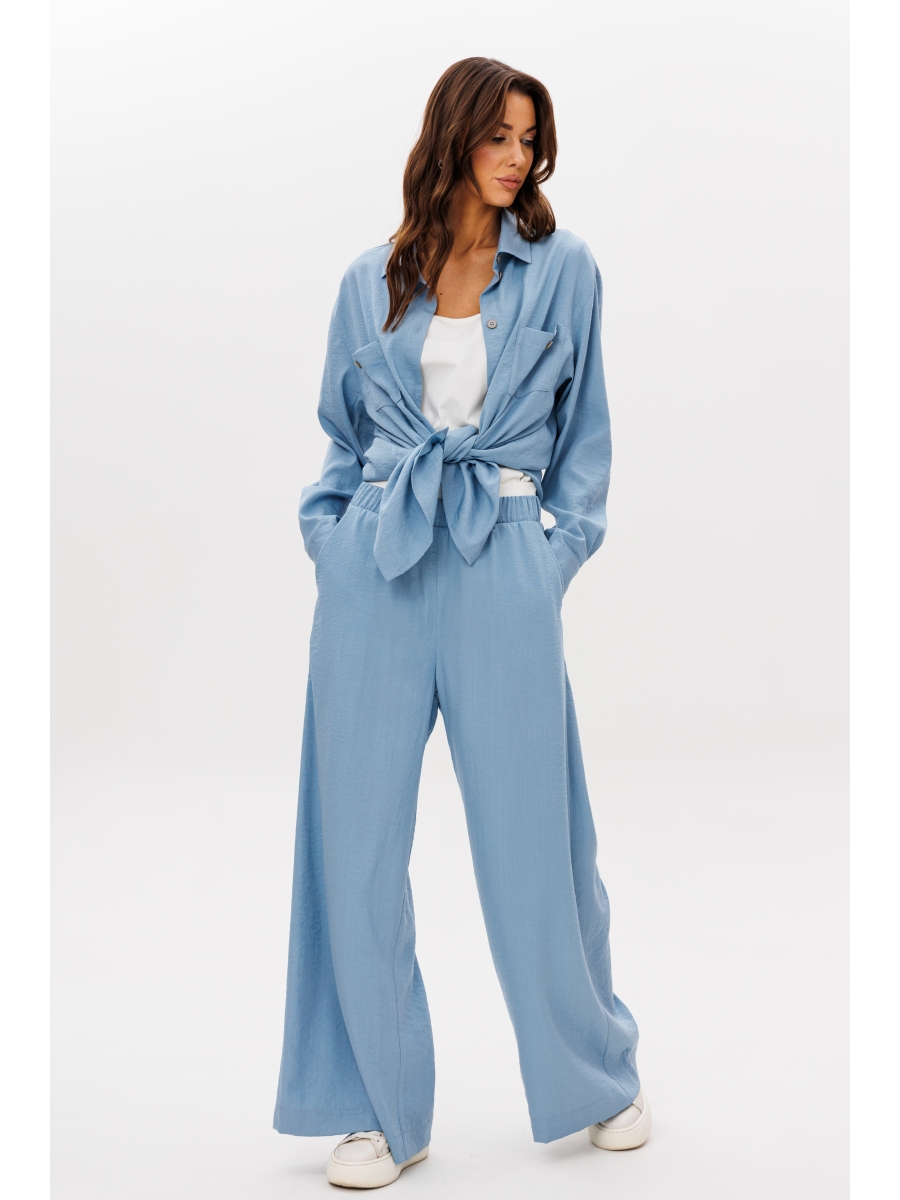 Свободная широкая рубашка и брюки-палаццо. Силуэт оверсайз, покрой рубашечный, воротник классический рубашечный с отрезной стойкой. Полочка, с отрезной кокеткой и накладными карманами. Спинка с отрезной кокеткой. Рукав с отрезной манжетой.