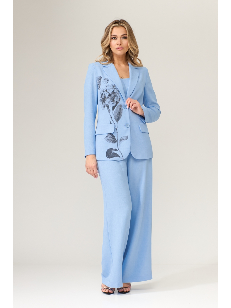 Брюки расширенные книзу с притачным поясом. По передней и задней частям брюк вытачки. По правому переду жакета выполнена декоративная печать.