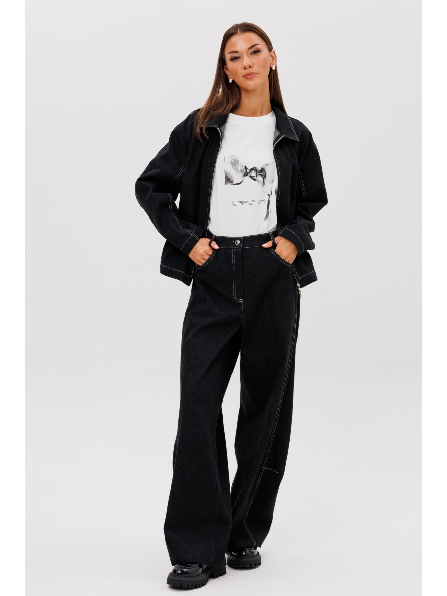 Брюки ""baggy"" из денима, с интересным худящим эффектом, достигаемым за счет отрезной боковой части, смещенной на передних и задних половинках.