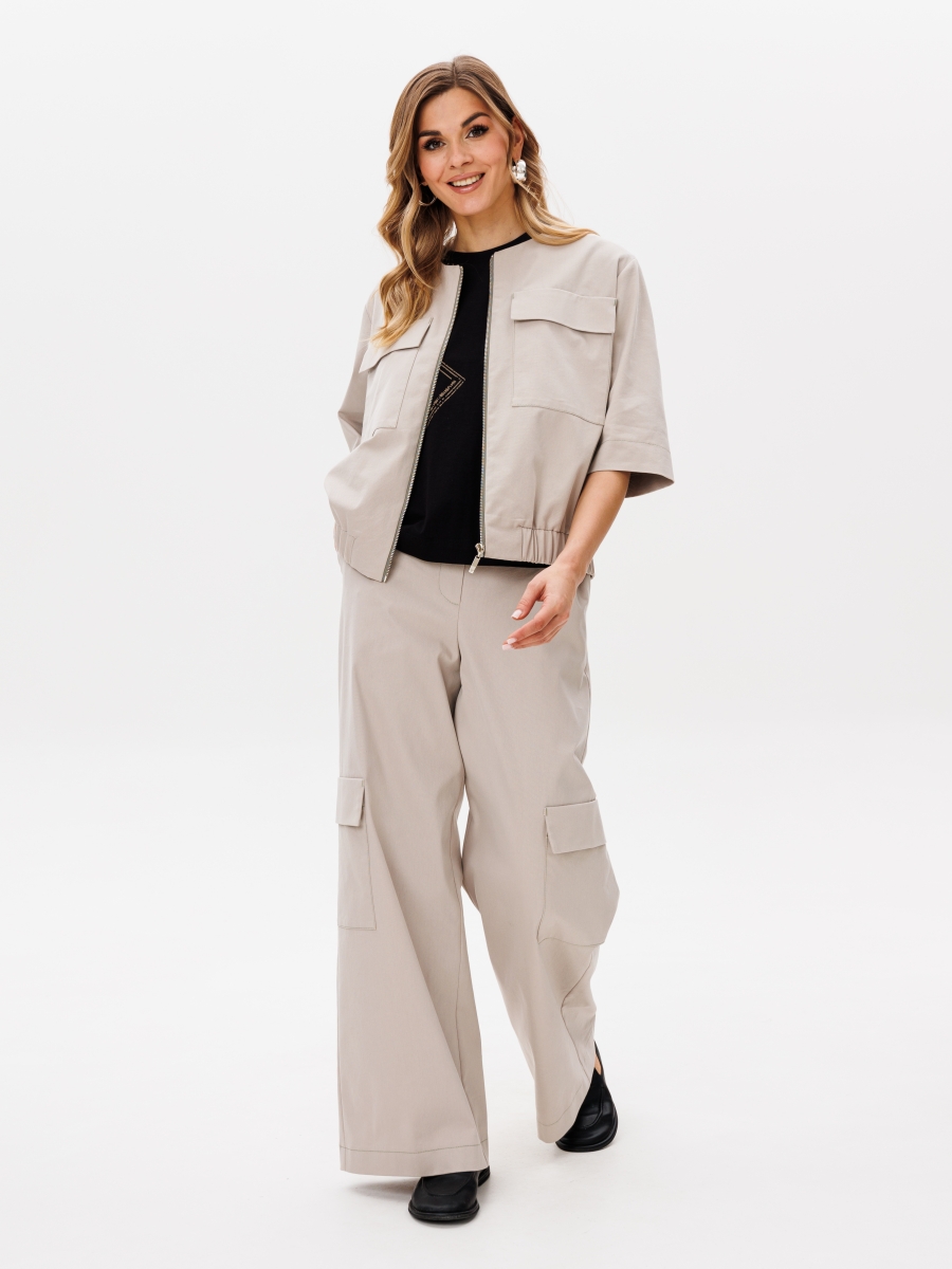 Жакет с застежкой на молнии крупными настрочными карманами с клапанами по переду. Рукав втачной одношовный. Низ жакета собран на планку с резинкой.