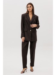 Жакет свободного расширенного силуэта, втачного покроя с центральной застёжкой и классическим английским воротником. Полочка с отрезным бочком, нагрудной вытачкой и прорезным карманом с клапаном. Спинка с центральным швом, шлицей и отрезным бочком. Рукав двухшовный с отлетной шлицей.