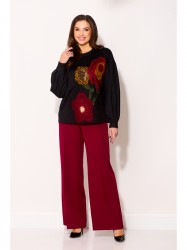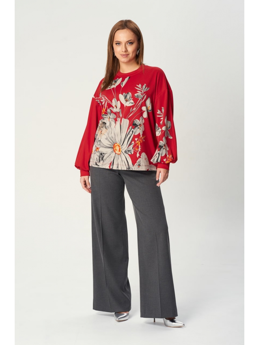 Джемпер свободного силуэта из трикотажной ткани с принтом. Рукав втачной двухшовный со складками по низу и манжетой. Спинка со средним швом. Горловина обработана планкой.