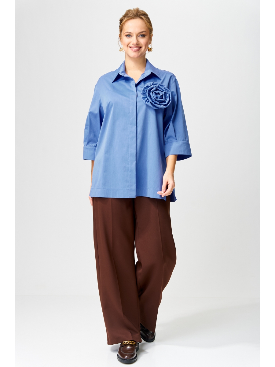Рубашка прямого силуэта из хлопковой ткани. Перед с центральной застежкой потайной планкой. Воротник на стойке. На правой части рубашки сверху съемная брошь цветок из основной ткани. Спинка с кокеткой и складкой в нижней части. Рукав втачной рубашечного кроя с широкой манжетой по низу и складками. Низ рубашки фс широкой подгибкой, по бокам разрезы.