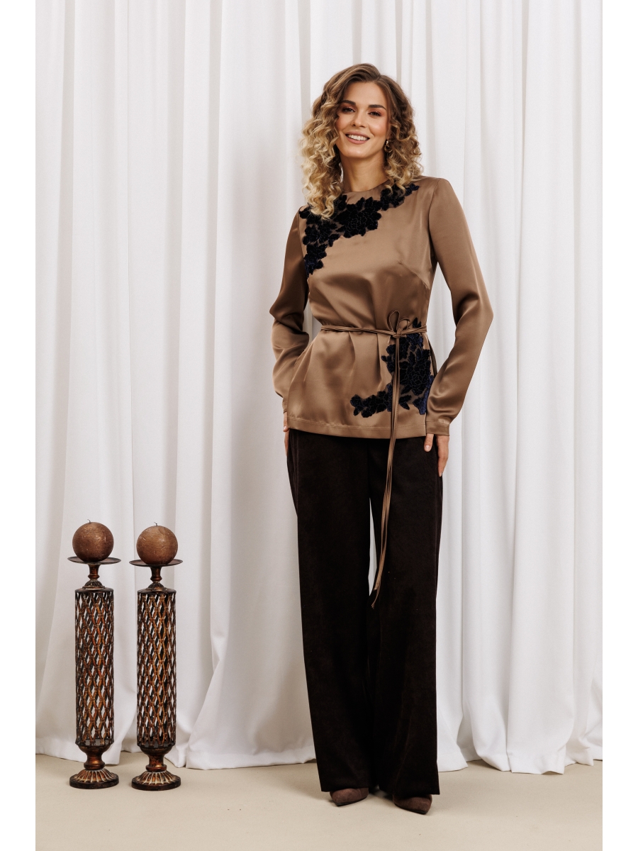 Блузка прямого силуэта выполнена из атласной ткани. Перед с нагрудной вытачкой. Спинка со средним швом и застежкой "капелькой" на петлю и пуговицу сверху. Рукав втачной одношовный. В боковых швах разрезы. По переду настрочена аппликация из велюровых цветов на сетке. К блузке прилагается пояс из основной ткани.