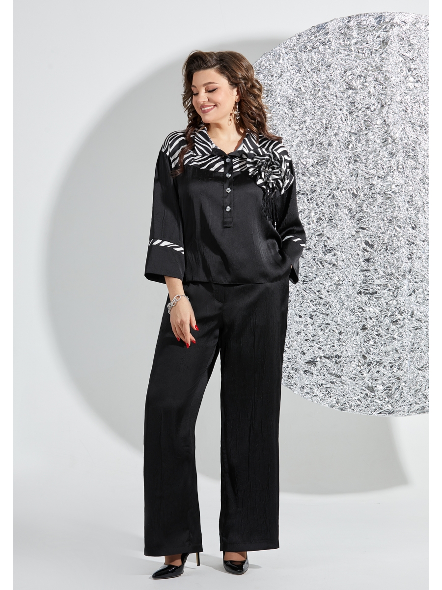 Брючный комплект, свободного покроя, выполнен из шелкового атласа с крэш-эффектом и принтованного атласа. Состоит из блузы и брюк.