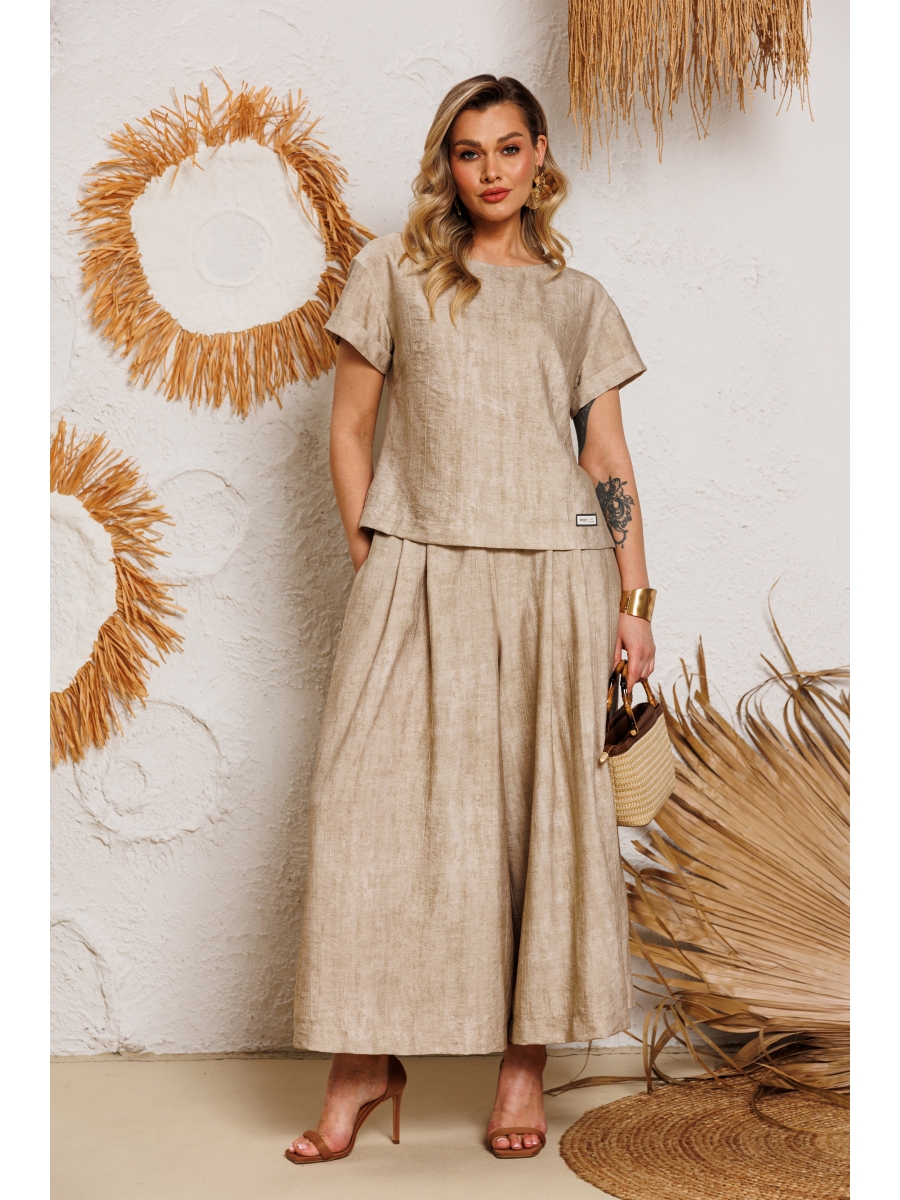 Брюки юбка прямые, со складками по переду и спинке, выполнены из вискозной ткани с добавлением хлопка с эффектом жатки. Брюки-юбка на поясе, по бокам с резинкой, по спинке с застежкой на потайную молнию и пуговицу.