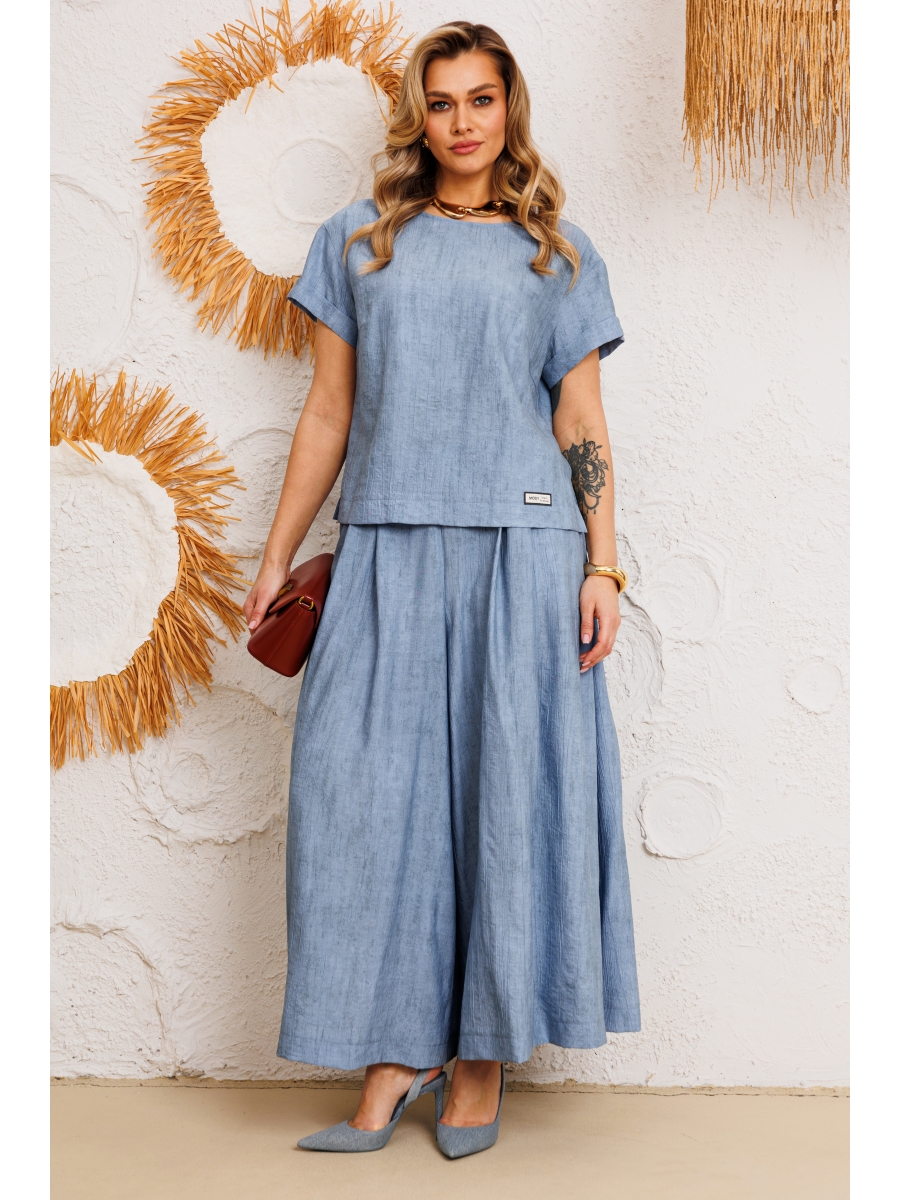 Брюки юбка прямые, со складками по переду и спинке, выполнены из вискозной ткани с добавлением хлопка с эффектом жатки. Брюки-юбка на поясе, по бокам с резинкой, по спинке с застежкой на потайную молнию и пуговицу.
