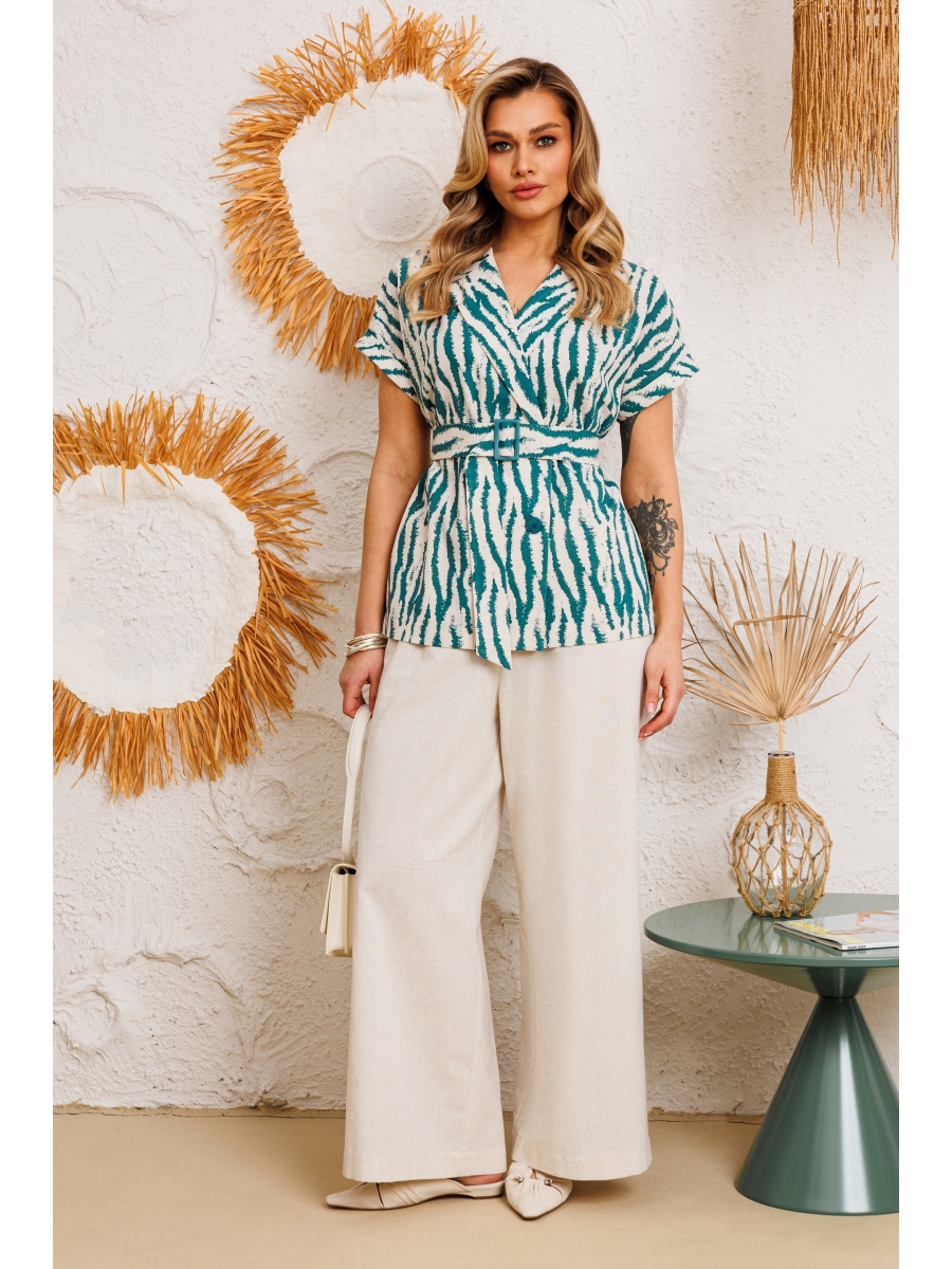 Жакет полуприлегающего силуэта, выполнен из натуральной льняной ткани с добавлением вискозы. Жакет с V-образным вырезом горловины, без подкладки, с застежкой по переду на пуговицы. Рукав спущенный, с манжетой.