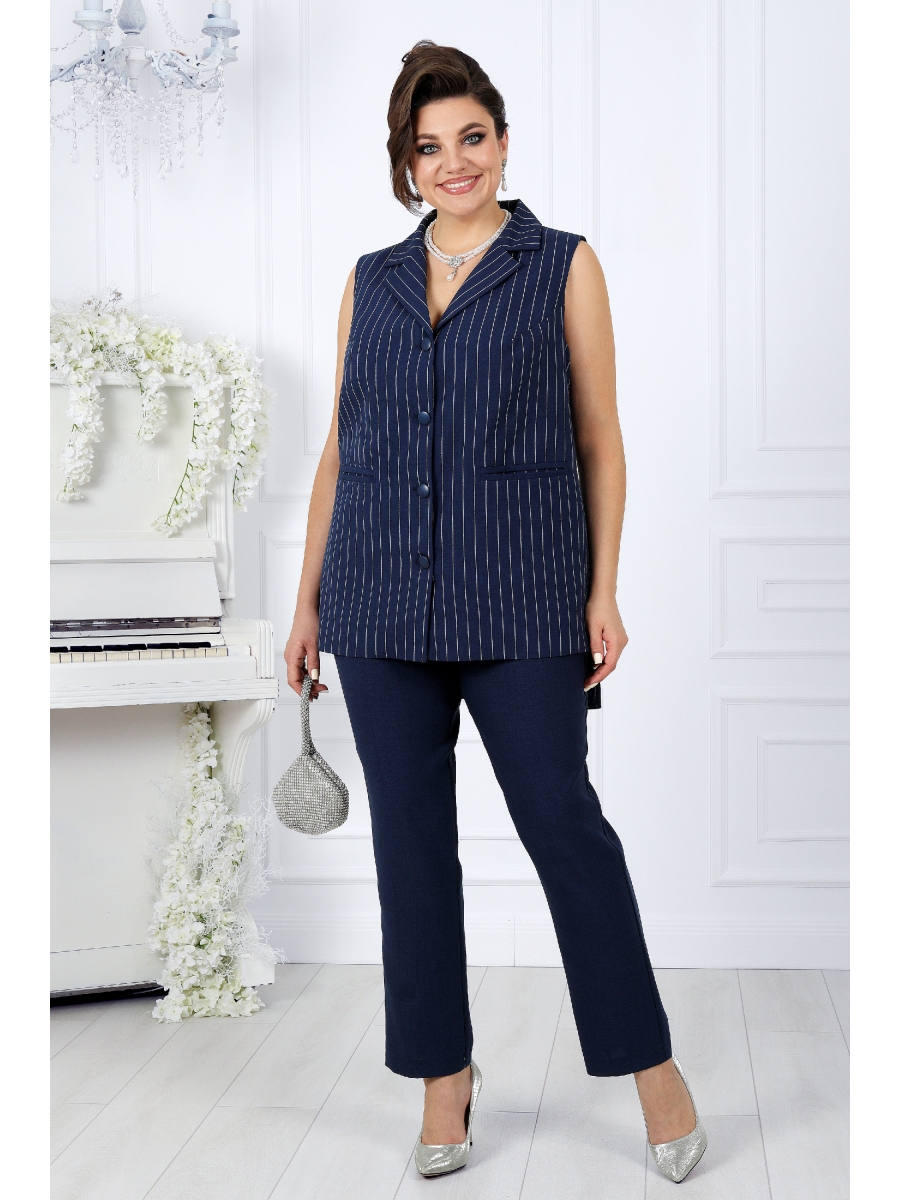 Комплект брючный 2-х предметный, состоящий из жилета, выполненного из ткани полоска, на хлопковой подкладке, и брюк из однотонной ткани.