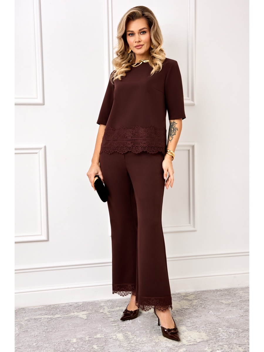 Брюки на поясе, по спинке с резинкой, спереди с застежкой на молнию и пуговицу. Брюки модного в этом сезоне силуэта, слегка заужены в области колена и расклешены к низу. Низ брюк декорирован французским кружевом.